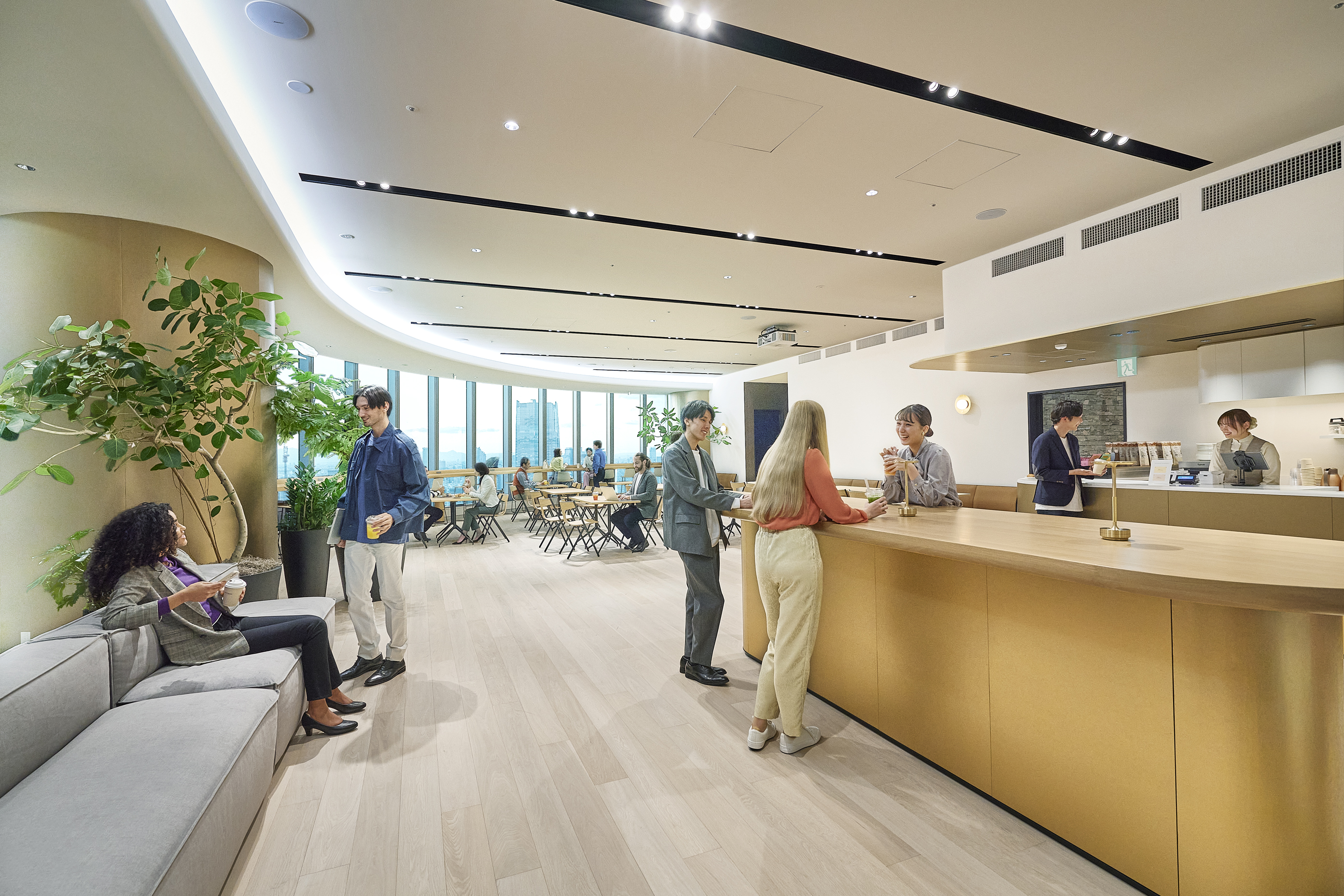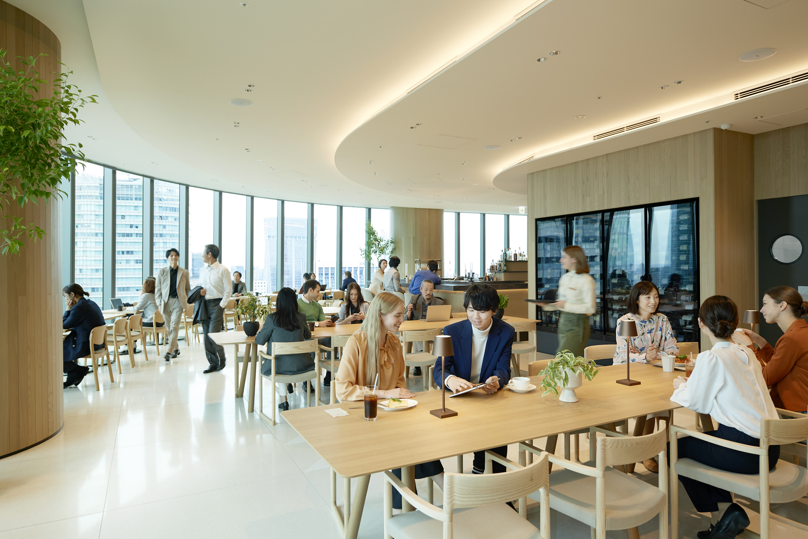 昼間はワークプレイス&カフェテリア、夜はバーラウンジとして、カジュアルで心地よい空間でワーカー同士のコミュニケーションや交流を促進するサードプレイスのような場となります。WELL認証*の基準を満たす、健康に配慮した食事メニューをはじめ、ワーカーのウェルネスを食の側面からサポートします。
